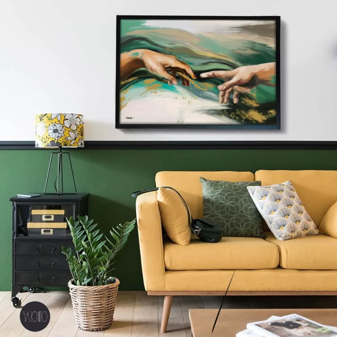 O impresso é curado, refilado manualmente, esticado de forma artesanal e cuidadosamente disposto e grampeado no Chassi e emoldurado.